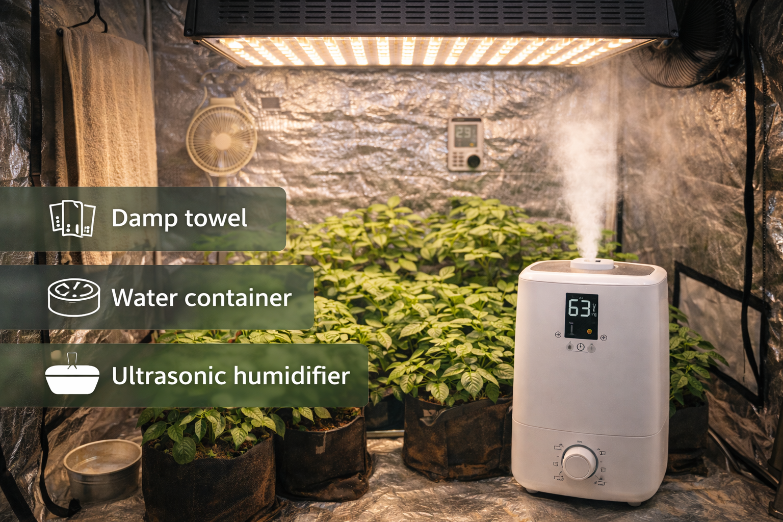 Jedním z nejúčinnějších způsobů jak zvýšit vlhkost v growboxu je použití zvlhčovače vzduchu. Tento přístroj vytváří jemnou vodní mlhu, která zvyšuje vlhkost v prostoru growboxu. Moderní zvlhčovače umožňují také regulaci vlhkosti pomocí hygrometru.