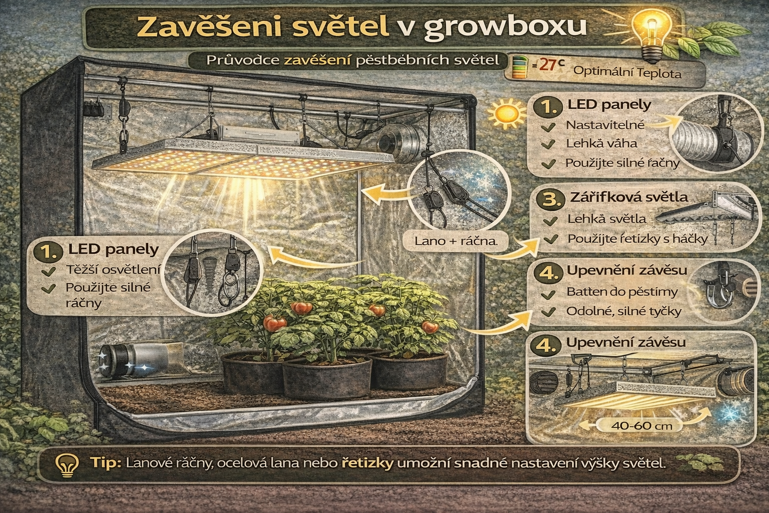 Zkušení pěstitelé často používají kvalitní nastavitelné závěsy, které umožňují rychlé a přesné nastavení výšky světla.