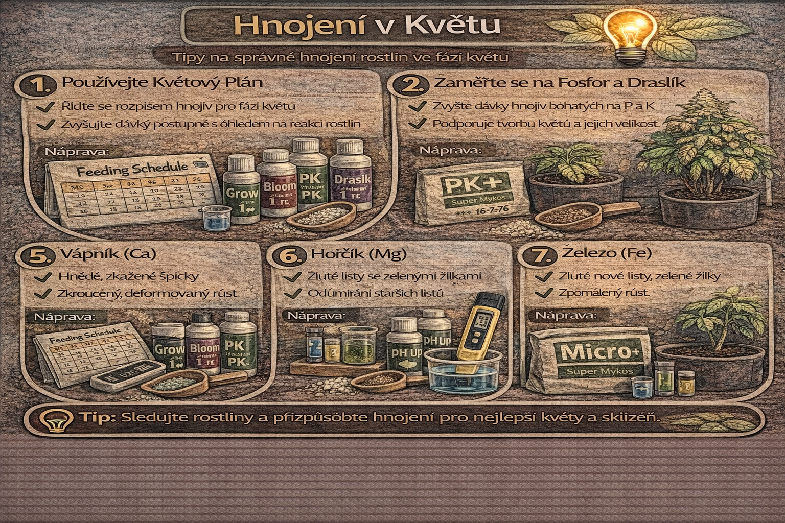 Při hnojení v květu je důležité přejít z růstových hnojiv na květová hnojiva. Tato hnojiva mají upravený poměr živin tak, aby podporovala tvorbu květů.