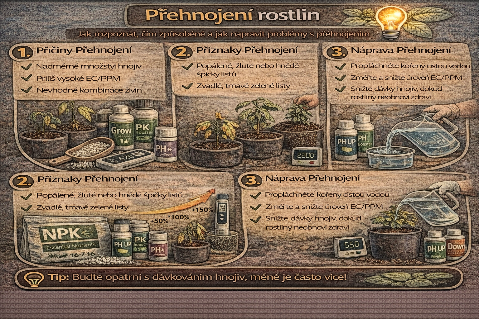 Pokud pěstitel dodržuje správné dávkování hnojiv, kontroluje hodnoty pH a EC a sleduje stav rostlin, může přehnojení snadno předejít a zajistit zdravý růst rostlin.