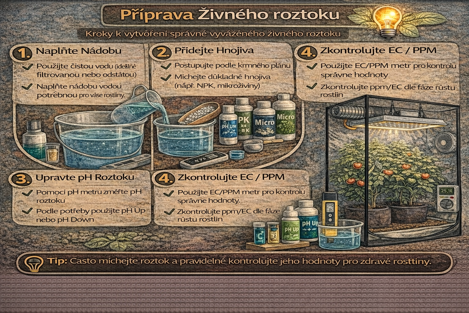 Příprava živného roztoku je klíčová pro správnou výživu rostlin při hydroponickém i indoor pěstování. Správně připravený roztok dodává rostlinám všechny potřebné živiny v optimálním poměru.